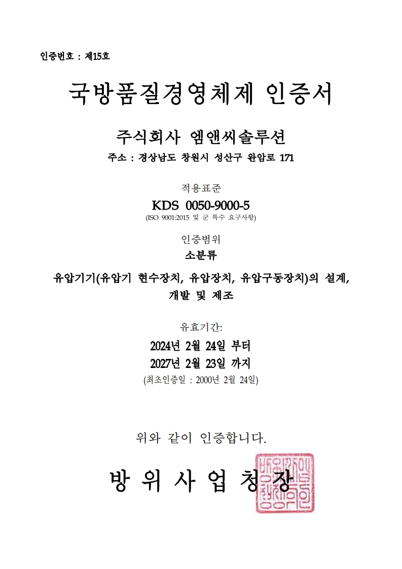 1 | KDS 0050-9000-5 | 2000.02.24 | 방위사업청 | 유압기 현수장치, 유압장치, 유압구동장치의 설계, 개발 및 제조 |